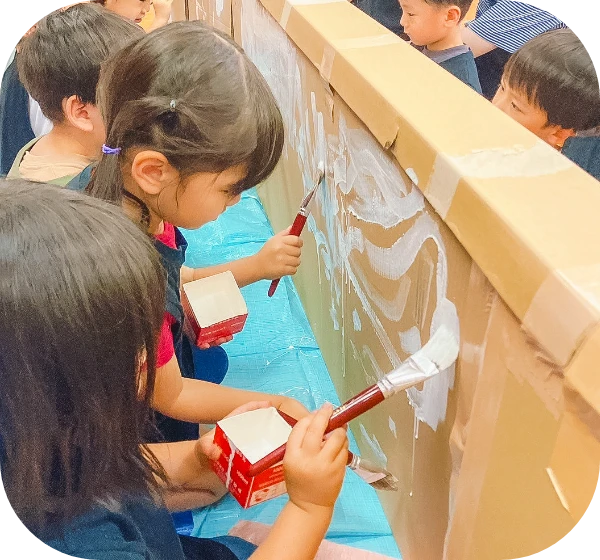 す。作品を完成させることだけを目的とするのではなく、低年齢児のうちから様々な素材を見たり、触れたり、匂いを嗅いだりしながら、実際に感じた経験をもとに表現することを大切にしています。形にとらわれず、個性あふれた自分だけの作品を大切にしたり、友だちと一緒に作っていく工程を楽しんだりしています。