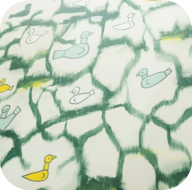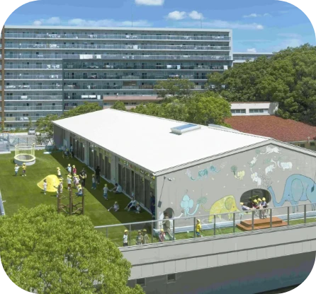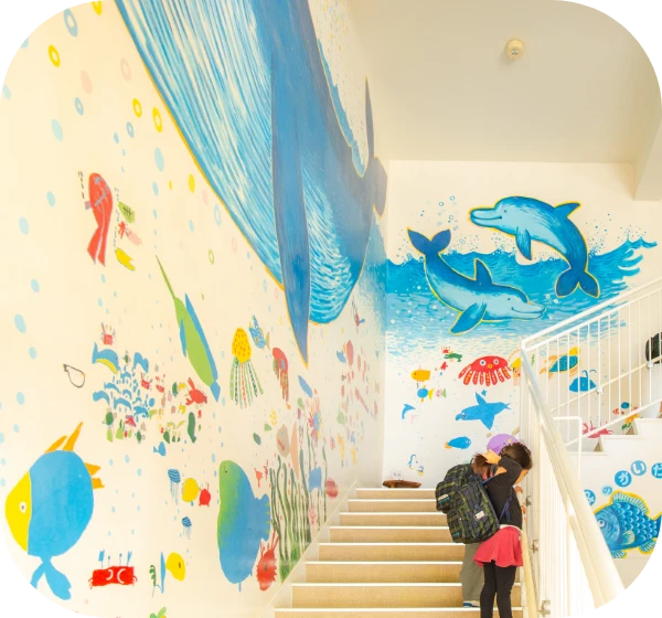 2023年4月に新築の分園では「ミナペルホネン」の創立者 皆川明氏が描いてくださったどうぶつたちがお出迎え。のびのびと遊ぶことができる人工芝の園庭。