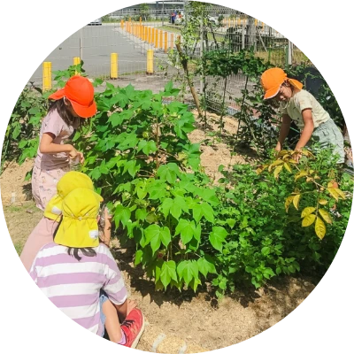 栽培ボランティアの方々と共に野菜を育てたり、植物を栽培したりできる土の園庭では、「命」を育てています。