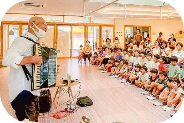 また、広々とした室内には、保護者や地域の方にもご利用いただけるよう「manabiiマルシェ」「料理教室」「体操教室」などができるスペースを用意し、地域の中のこども園として運営しています。